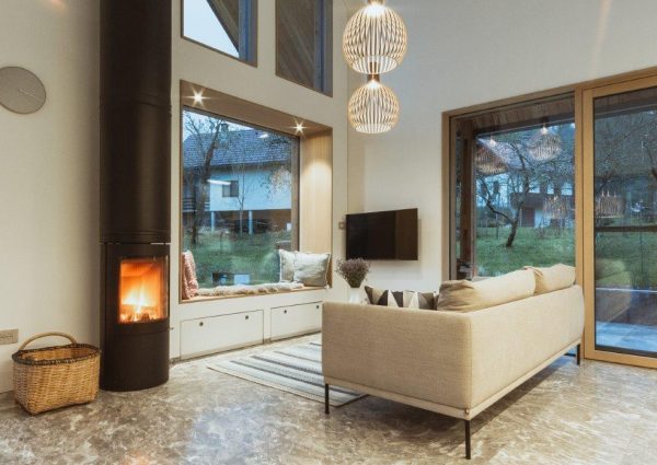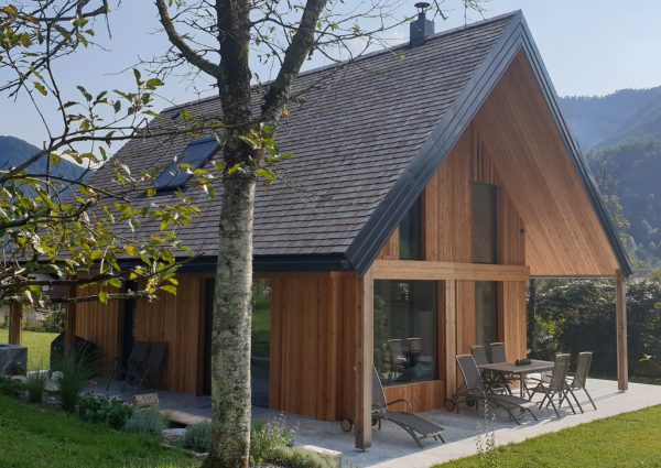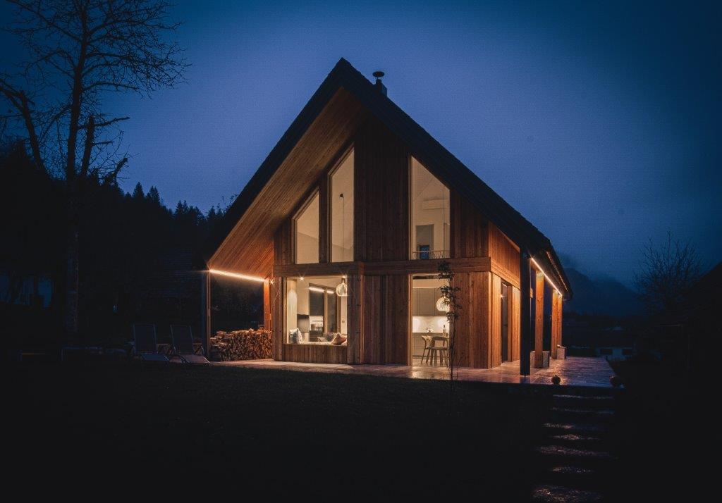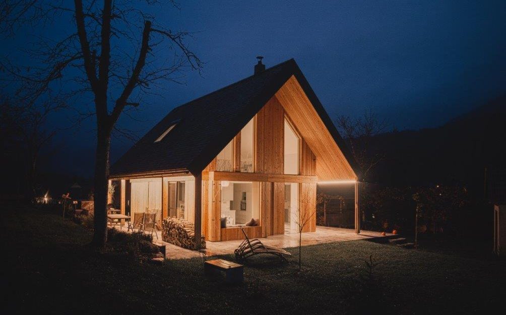 În dialectul din Kostel, „bale, bale” înseamnă „vino, vino”. Numele casei vă invită la confortul naturii care o înconjoară. Este construită în stil modern, dar respectând patrimoniul cultural și arhitectural local. Acoperișul este realizat din șindrilă de larice în trei straturi, iar fațada este ventilată cu scânduri verticale din larice. Clădirea pare să plutească deasupra unei baze din piatră de marmură Hotavlje. Spațiul central deschis, cu o înălțime de 7,5 m, oferă o priveliște superbă către Stânca Kuželj. Șemineul negru este elementul central al spațiului. În interior, stejarul masiv este materialul de bază. Masa de sufragerie, scaunele și măsuța de cafea demonstrează măiestria meticuloasă a tâmplarilor, subliniind rezistența și soliditatea stejarului. Casa se află în regiunea Kočevje. (Foto: Nik Grmovšek)