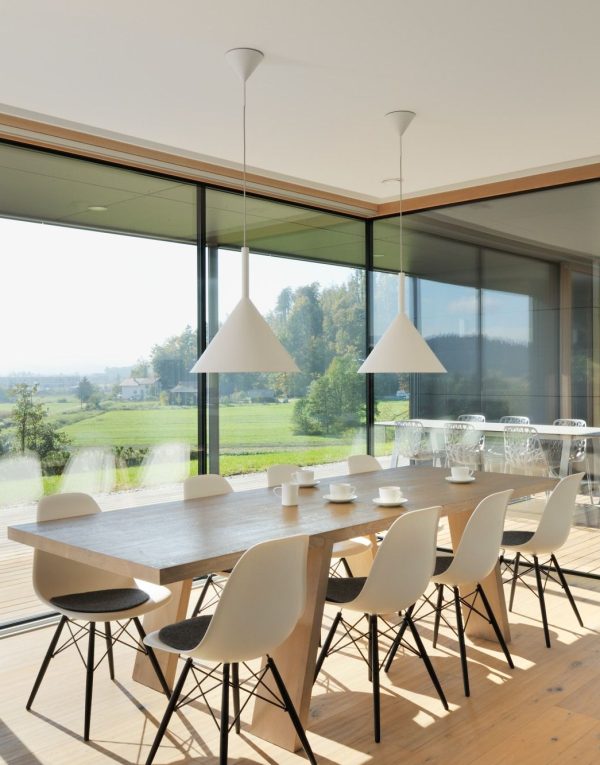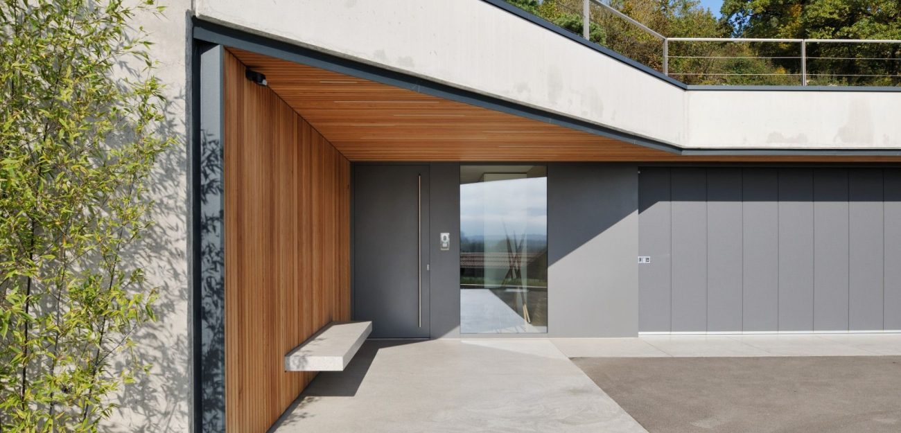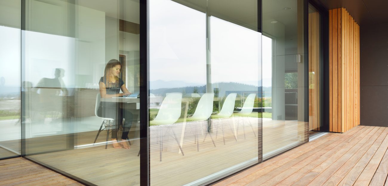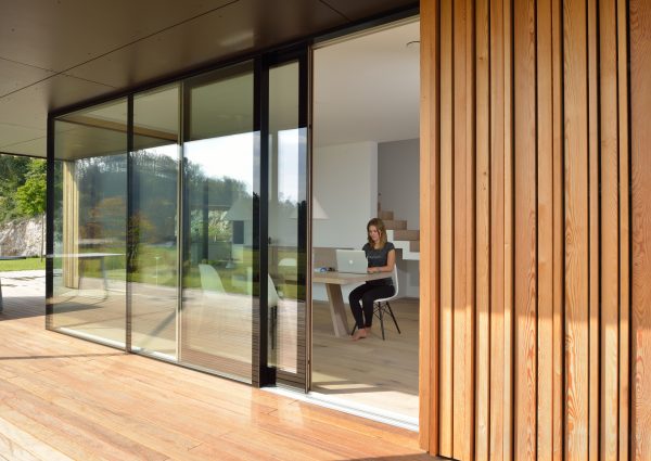 Platoul superior formează un spațiu privat în jurul casei, conectat la zonele de zi prin suprafețe mari vitrate.