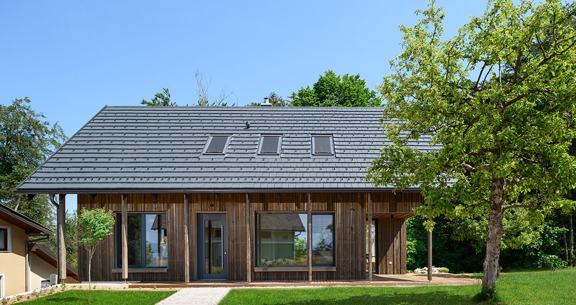 Clădirea, cu spații de locuit la parter și spații auxiliare dedesubt, valorifică panta existentă a terenului. Partea neacoperită este realizată în întregime din lemn și este înconjurată de o fațadă ventilată din lemn, tratată cu un agent de încărunțire accelerată pentru a obține de la început o culoare uniformă și permanentă. Lemnul de molid și brad ales local, precum și tencuielile din argilă la interior, conferă clădirii o valoare suplimentară de sustenabilitate.