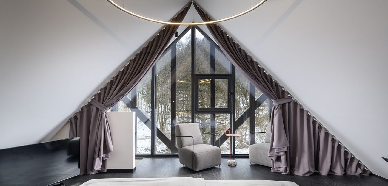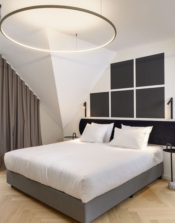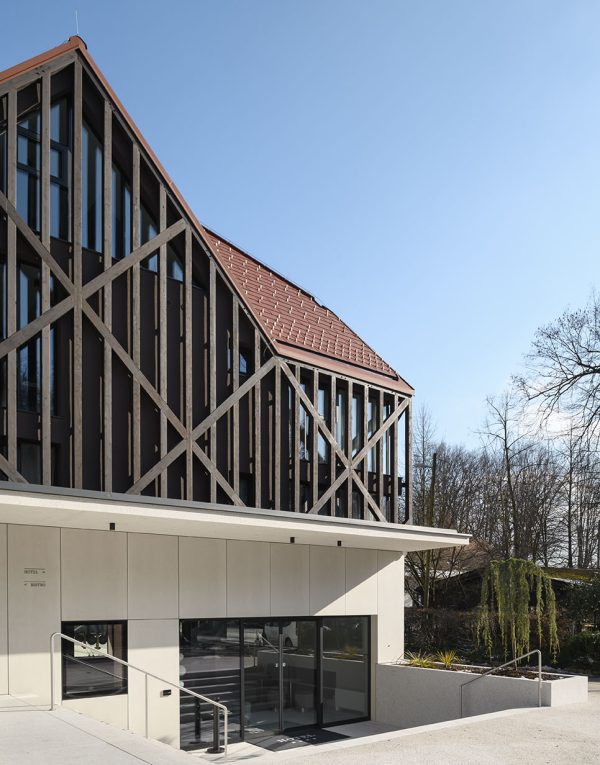 Clădirea a fost proiectată pentru a valorifica la maximum suprafața construită permisă. Amplasarea și compartimentarea atent gândită a permis realizarea a 18 camere de hotel, incluzând două apartamente cu loggie și două apartamente cu loggie la mansardă. Spațiile de serviciu se află în subsol, în timp ce la parter sunt zonele publice, cu o recepție parțial retrasă și o cafenea cu grădină. Designul conceptual al fațadei a fost inspirat de jocul de basm al umbrelor și soarelui și de elementele structurale vizibile din lemn ale vilelor din cartierul adiacent Rožna dolina.