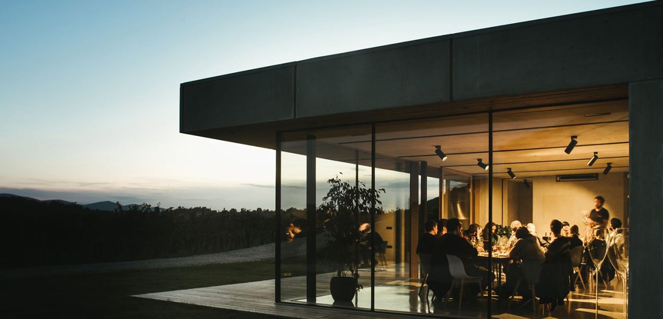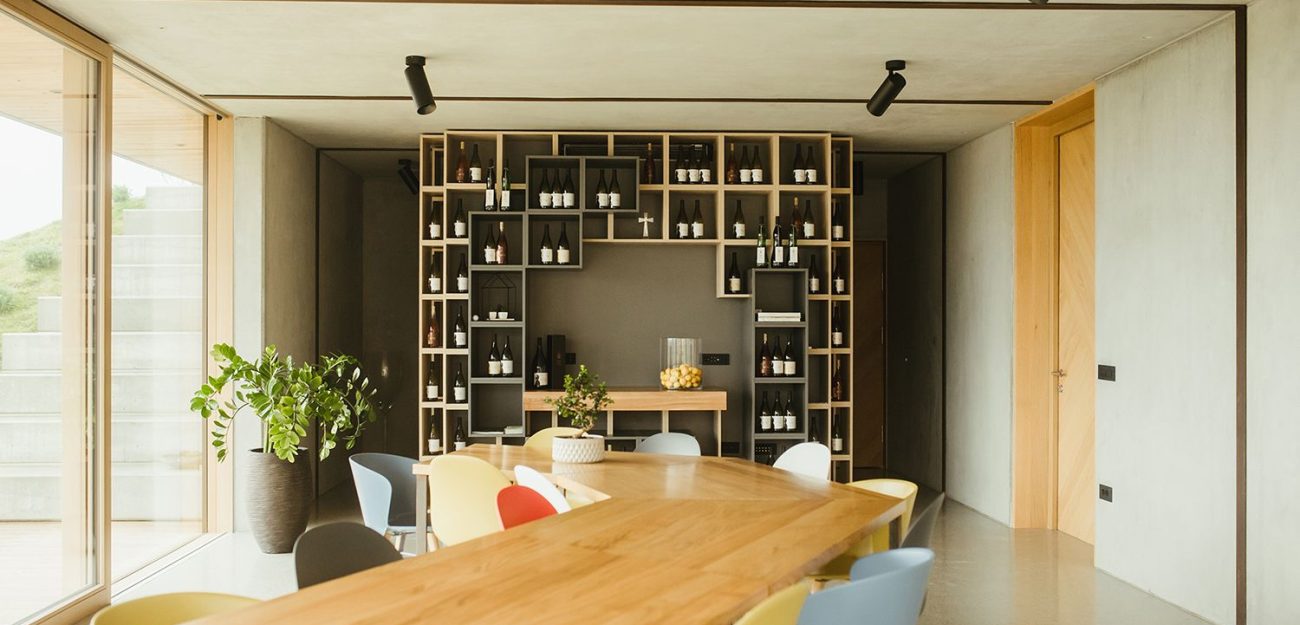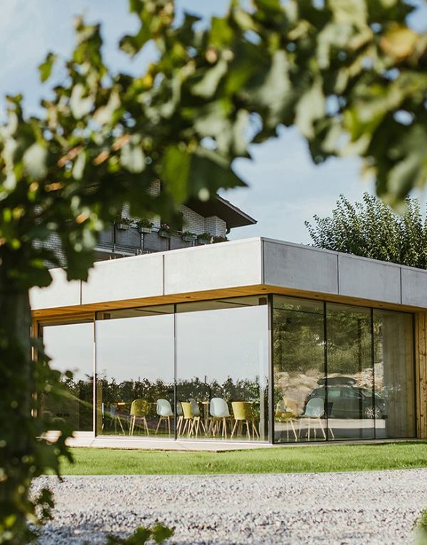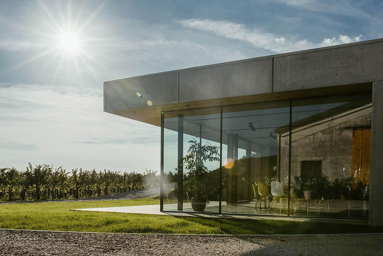Arhitecții au avut sarcina de a proiecta o sală de degustare separată, unde oaspeții pot savura o prezentare autentică a tinerilor viticultori din Vipava. Pe lângă vin și gastronomie, noul spațiu oferă și priveliști atractive asupra văii, completând experiența vizitatorilor. Clădirea are o formă rectangulară, cu linii curate. Printr-un perete vitrat mare pe colț și o terasă acoperită, trecem fluid din interior în exterior. Învelișul din sticlă este înconjurat de o structură vizibilă din beton, iar placarea interioară din lemn conferă căldură și confort.